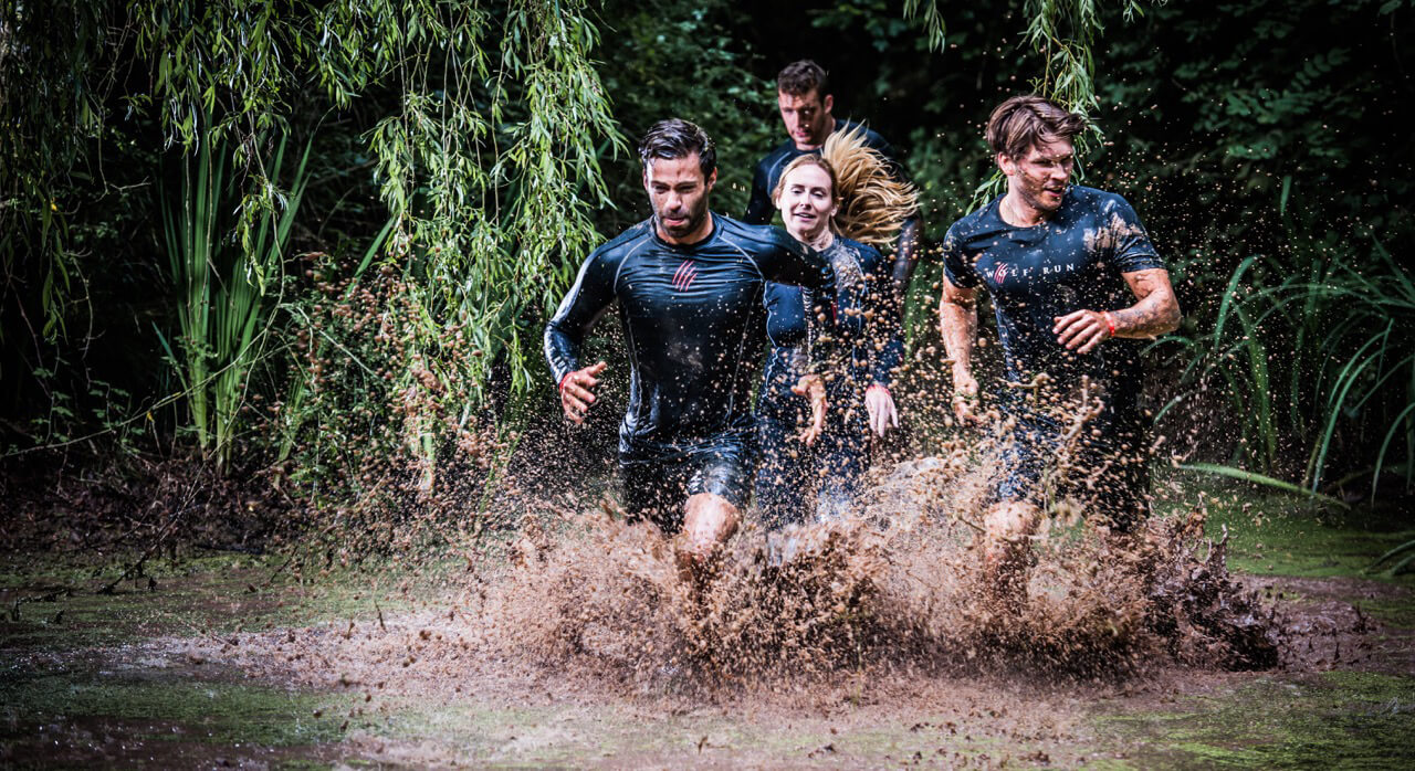 A high-energy obstacle challenge through mud, water, and woodland testing teamwork and resilience.
